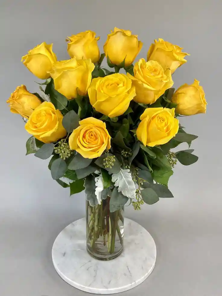 Un elegante jarrón con 12 rosas amarillas, expresando amistad y buenos deseos. Ideal para compartir momentos especiales y alegrar el día.Nota: La flor puede ser sustituida dependiendo de la disponibilidad de color y del producto."Mensaje Personalizado" máximo de 30 caracteres (Dejar el mensaje en el chat, los comentarios no se previsualizan para la tienda, por lo que si se dejan allí no podrá ser incluido).