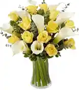 Jarrón de rosas amarillas con cartuchos blancos Un sofisticado jarrón con una combinación de cartuchos y 12 rosas, creando un arreglo elegante y lleno de significado. Nota: La flor puede ser sustituida dependiendo de la disponibilidad de color y del producto. "Mensaje Personalizado" máximo de 30 caracteres (Dejar el mensaje en el chat, los comentarios no se previsualizan para la tienda, por lo que si se dejan allí no podrá ser incluido).