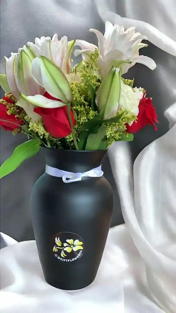 Jarrón de 6 rosas rojas y blancas acompañadas de 3 varas de lirio y solidago. Nota: La flor puede ser sustituida dependiendo la disponibilidad de color y del producto “Mensaje Personalizado” máximo de 30 caracteres (Dejar el mensaje en el chat, los comentarios no se previsualizan para la tienda por lo que si se dejan allí no podrá ser incluido).
