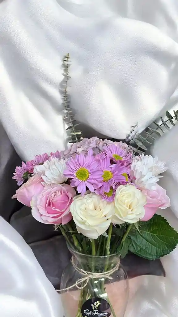 Jarron de 12 rosas entre blancas y rosadas acompañadas de margaritas moradas y blancas y eucalipto. Nota: La flor puede ser sustituida dependiendo la disponibilidad de color y del producto “Mensaje Personalizado” máximo de 30 caracteres (Dejar el mensaje en el chat, los comentarios no se previsualizan para la tienda por lo que si se dejan allí no podrá ser incluido).