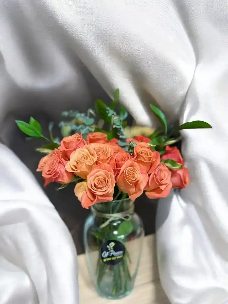 Jarron de 12 rosas naranjas acompañadas de eucalipto y rusco. Nota: La flor puede ser sustituida dependiendo la disponibilidad de color y del producto “Mensaje Personalizado” máximo de 30 caracteres (Dejar el mensaje en el chat, los comentarios no se previsualizan para la tienda por lo que si se dejan allí no podrá ser incluido).