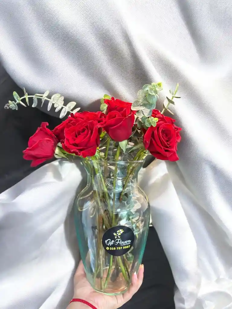Jarron con aprox. 12 rosas rojas y eucalipto. Nota: La flor puede ser sustituida dependiendo la disponibilidad de color y del producto “Mensaje Personalizado” máximo de 30 caracteres (Dejar el mensaje en el chat, los comentarios no se previsualizan para la tienda por lo que si se dejan allí no podrá ser incluido).