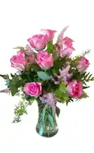 Jarrón de rosas rosadas Un delicado jarrón con 12 rosas rosadas que simbolizan ternura y gratitud, perfecto para expresar sentimientos especiales. Nota: La flor puede ser sustituida dependiendo de la disponibilidad de color y del producto. "Mensaje Personalizado" máximo de 30 caracteres (Dejar el mensaje en el chat, los comentarios no se previsualizan para la tienda, por lo que si se dejan allí no podrá ser incluido).