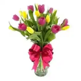 jarron de 12 tulipanes entre amarillos y morados La flor puede ser sustituida dependiendo la disponibilidad de color y del producto “Mensaje Personalizado” máximo de 30 caracteres (Dejar el mensaje en el chat, los comentarios no se previsualizan para la tienda por lo que si se dejan allí no podrá ser incluido)