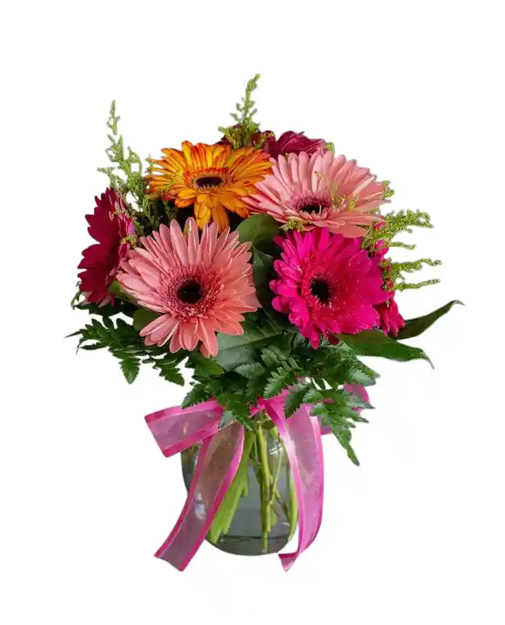 Jarrón de gerberas Un hermoso jarrón con 4-6 gerberas de colores vibrantes, ideal para iluminar cualquier espacio y transmitir alegría con su frescura. Nota: La flor puede ser sustituida dependiendo de la disponibilidad de color y del producto. "Mensaje Personalizado" máximo de 30 caracteres (Dejar el mensaje en el chat, los comentarios no se previsualizan para la tienda, por lo que si se dejan allí no podrá ser incluido).