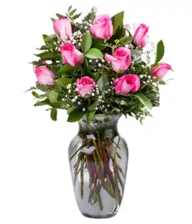 jarron con 12 rosas rosadasLa flor puede ser sustituida dependiendo la disponibilidad de color y del producto “Mensaje Personalizado” máximo de 30 caracteres (Dejar el mensaje en el chat, los comentarios no se previsualizan para la tienda por lo que si se dejan allí no podrá ser incluido)