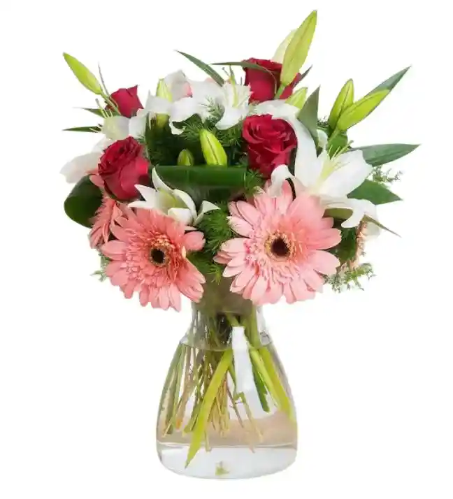 mini jarron con 2 gerberas y 3 rosas con follaje La flor puede ser sustituida dependiendo la disponibilidad de color y del producto “Mensaje Personalizado” máximo de 30 caracteres (Dejar el mensaje en el chat, los comentarios no se previsualizan para la tienda por lo que si se dejan allí no podrá ser incluido)