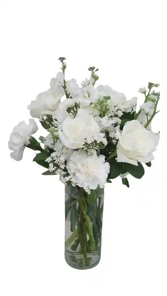Un elegante jarrón con aproximadamente 6 claveles blancos, 3 rosa blancas con gypso y rusco , símbolo de pureza y gratitud. Perfecto para transmitir serenidad y aprecio en cualquier ocasión especial.Nota: La flor puede ser sustituida dependiendo de la disponibilidad de color y del producto."Mensaje Personalizado" máximo de 30 caracteres (Dejar el mensaje en el chat, los comentarios no se previsualizan para la tienda, por lo que si se dejan allí no podrá ser incluido).