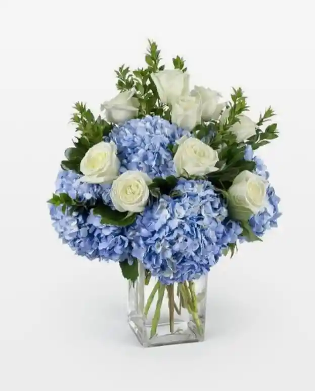 hortencias azules y rosas blancas en jarron