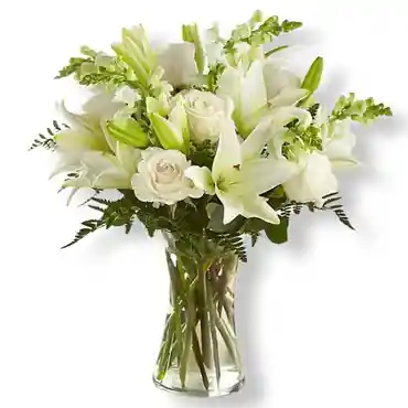 Jarron de 12 rosas blancas, 5 lirios blancos y 8 varas de follaje. La flor puede ser sustituida dependiendo la disponibilidad de color y del producto “Mensaje Personalizado” máximo de 30 caracteres (Dejar el mensaje en el chat, los comentarios no se previsualizan para la tienda por lo que si se dejan allí no podrá ser incluido)