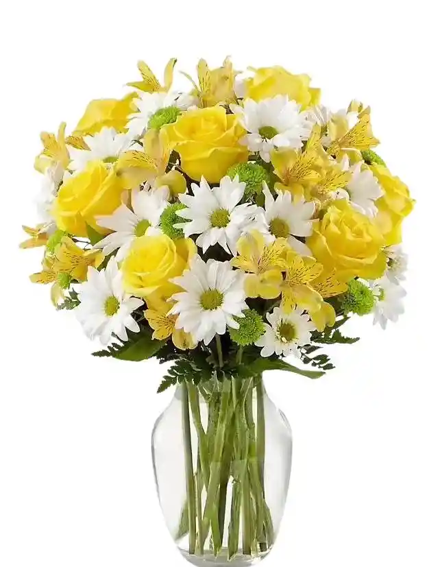 Jarrón amarillo de 12 rosas amarillas 1 paquete de margarita blanca y 1 paquete de astromelia amarillo con crisantemos verdes mini Nota: La flor puede ser sustituida dependiendo la disponibilidad de color y del producto “Mensaje Personalizado” máximo de 30 caracteres (Dejar el mensaje en el chat, los comentarios no se previsualizan para la tienda por lo que si se dejan allí no podrá ser incluido).