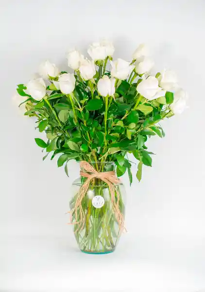 Jarron samaritano pequeño con 18 rosas blancas - follaje