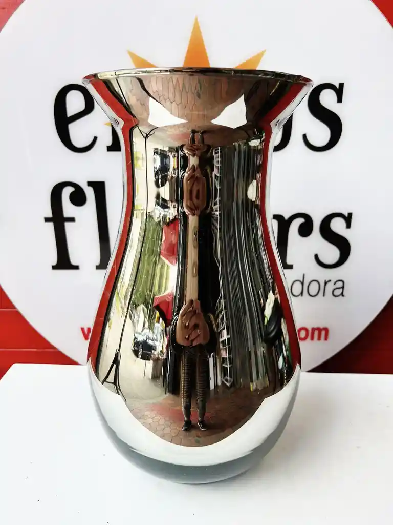 Jarrón premium en vidrio hologramado, con altura de 35 cm, diseño moderno y llamativo, ideal para arreglos protagonistas y decoración sofisticada.