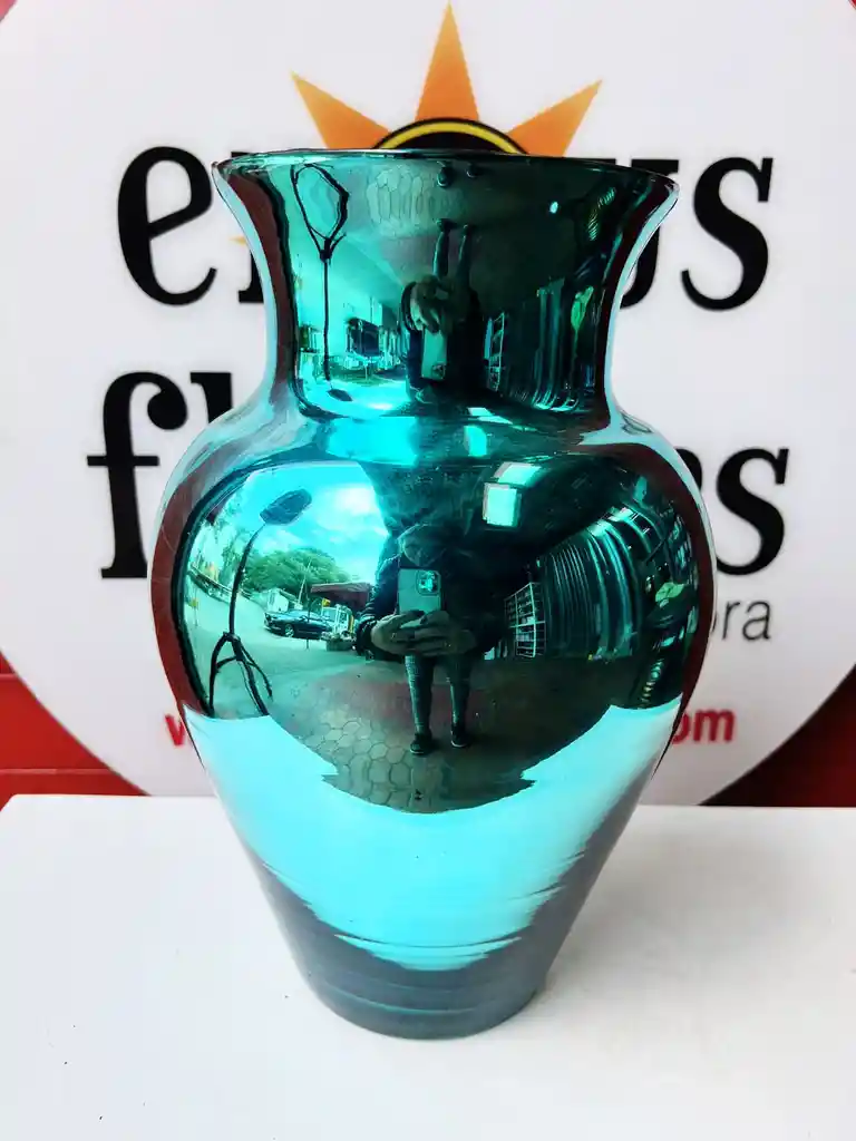 Jarrón Prisma hologramado de 33 cm, diseño moderno con efecto iridiscente, ideal para arreglos protagonistas y decoración elegante.