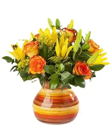jarron de 6 rosas naranjas , 4 lirios amarillos acompañados de rusco y soliago .La flor puede ser sustituida dependiendo la disponibilidad de color y del producto “Mensaje Personalizado” máximo de 30 caracteres (Dejar el mensaje en el chat, los comentarios no se previsualizan para la tienda por lo que si se dejan allí no podrá ser incluido)