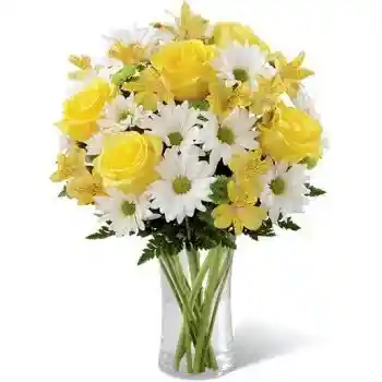Jarron con 10 varas de margaritas,8 rosas amarillas y 5 varas de astromelia.La flor puede ser sustituida dependiendo la disponibilidad de color y del producto “Mensaje Personalizado” máximo de 30 caracteres (Dejar el mensaje en el chat, los comentarios no se previsualizan para la tienda por lo que si se dejan allí no podrá ser incluido)