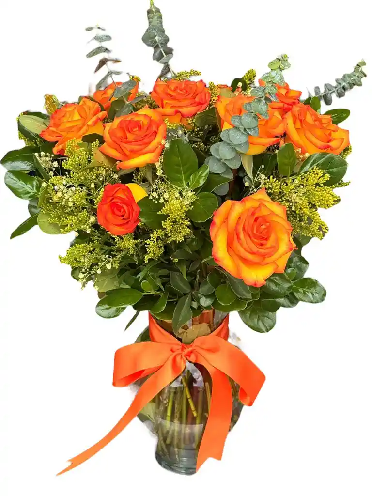 Arreglo floral x12 rosas tipo exportación en tonalidad confeti Follaje fino brillantina, eucalipto baby, solidago Moño en cinta de tela naranja Diseño elaborado en jarrón de vidrio caobo