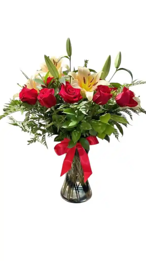 Jarron floral con 12 unidades de rosas rojas y 3 tallos de lirio blanco