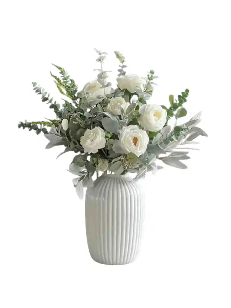 Jarrón de rosas blancas Un elegante jarrón con 12 rosas blancas y eucalipto que transmiten pureza y serenidad, ideal para cualquier ocasión especial. Nota: La flor puede ser sustituida dependiendo de la disponibilidad de color y del producto. "Mensaje Personalizado" máximo de 30 caracteres (Dejar el mensaje en el chat, los comentarios no se previsualizan para la tienda, por lo que si se dejan allí no podrá ser incluido).