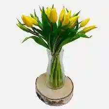 Jarron con 12 tulipanes amarillos . La flor puede ser sustituida dependiendo la disponibilidad de color y del producto “Mensaje Personalizado” máximo de 30 caracteres (Dejar el mensaje en el chat, los comentarios no se previsualizan para la tienda por lo que si se dejan allí no podrá ser incluido)