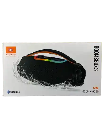 Parlante inalámbrico portátil con diseño tipo boombox, ideal para disfrutar música con sonido potente y envolvente. Cuenta con asa para fácil transporte y panel de control superior para manejar la reproducción de forma sencilla.