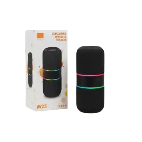 Parlante inalámbrico portátil con diseño cilíndrico moderno y compacto, ideal para llevar a cualquier lugar. Cuenta con luz LED decorativa que le da un estilo llamativo y controles integrados para un uso fácil. Perfecto para escuchar música en casa, reuniones o salidas.