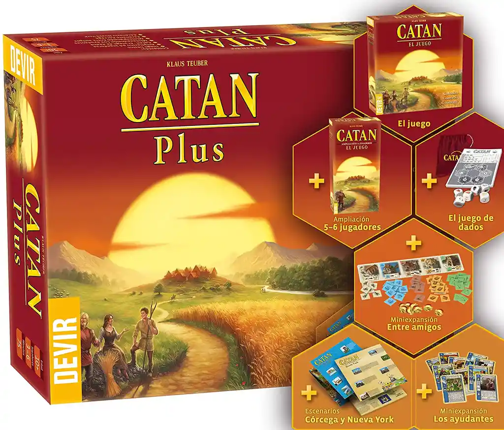 El juego básico, la ampliación para 5-6 jugadores, dos escenarios especiales y dos miniexpansiones… ¡en una sola caja! Todos los componentes adicionales pueden combinarse con los componentes del juego básico, y todos ellos pueden jugarse con hasta 6 jugadores. Cada una de las expansiones y escenarios aporta nuevas posibilidades de juego para Catan. Catan ha cautivado a millones de jugadores de todo el mundo. Un juego siempre sorprendente y siempre nuevo. ¡Pon rumbo a Catán!