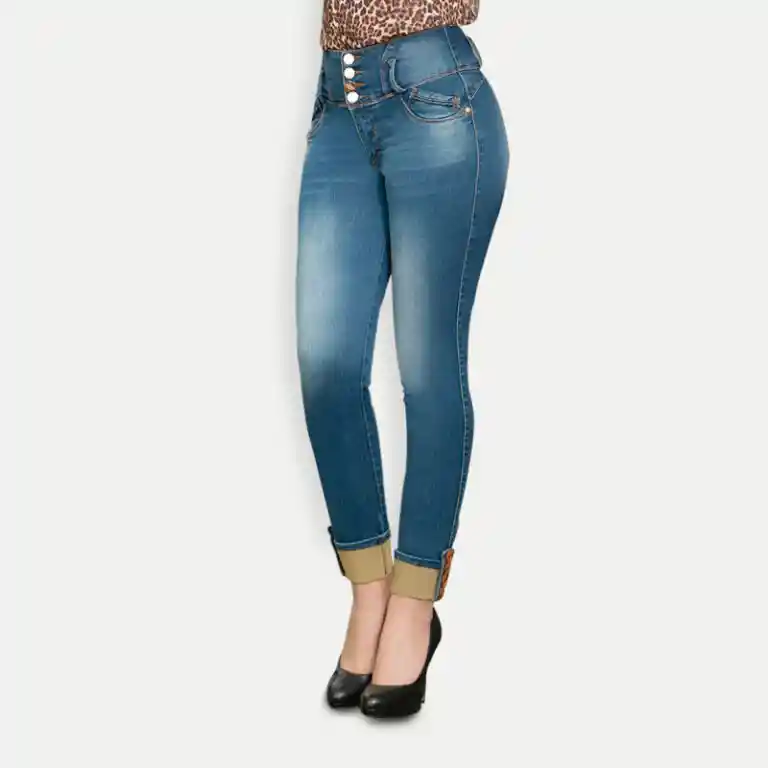 Jean elaborado con tela piel de durazno. Color azul medio. Bota tubo – tobillero. Tiro alto