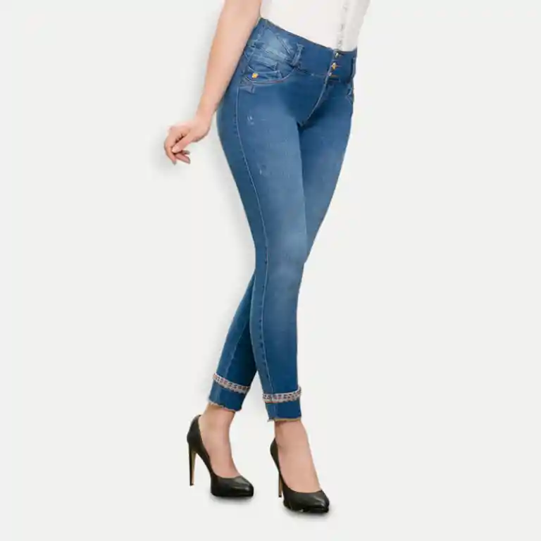 Jean elaborado con tela piel de durazno. Color azul medio. Bota tubo – tobillero. Tiro alto