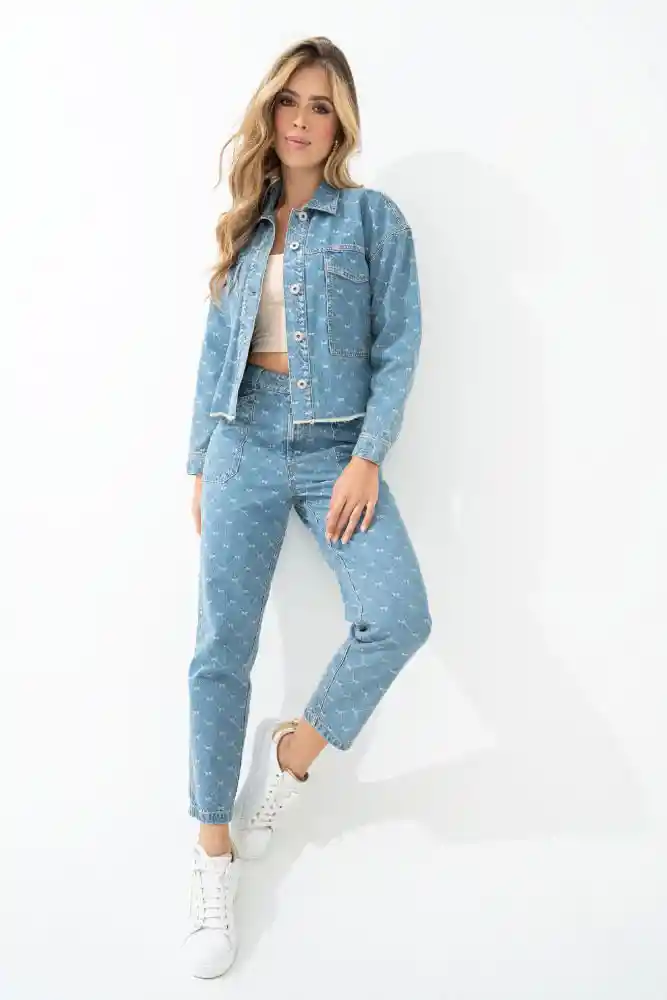 Mom en Denim Rígido 100% Algodón Tejido Jacquard Dobby Tiro Alto Tono Medio Bolsillo Parche en Frente y Posterior.