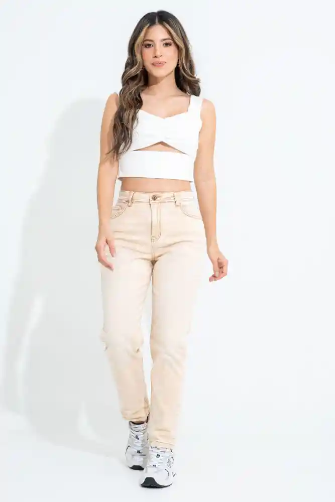 Mom en Denim Color Stretch Tiro Alto Tono Medio Con Manualidad Cinco Bolsillos.