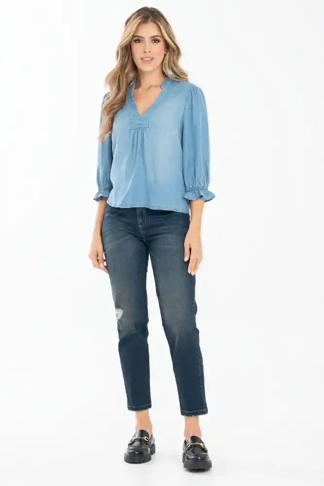 Mom Stretch Tiro Alto Tono Oscuro Con Manualidad Cinco Bolsillos.