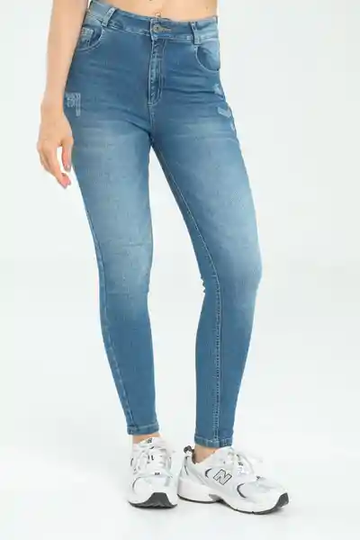 Fondo Entero Con Proceso de Manualidad Tono Medio Cinco Bolsillos Pasadores y Botón en Pretina Cierre Frontal Tiro Alto Bota Tubo.