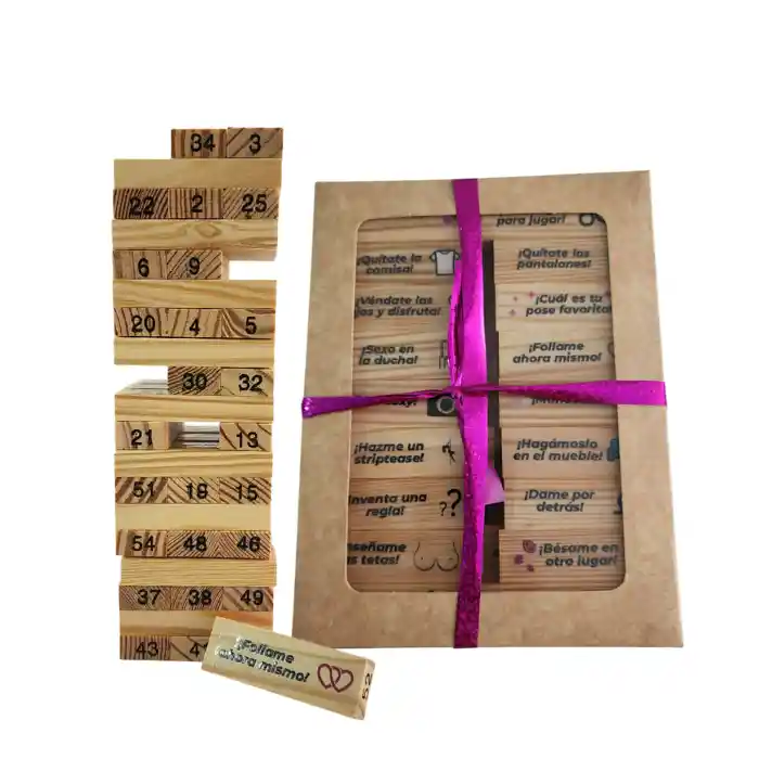 JENGA EROTICO Torre del amor para Parejas es un juego diseñado para adultos que busca fortalecer la conexión emocional y la diversión entre parejas. Con un formato físico y un enfoque en la destreza, este juego es ideal para quienes desean explorar su relación de una manera lúdica y entretenida. Con una capacidad para entre 2 y 10 jugadores, es perfecto para noches de cita o reuniones con amigos. La dinámica del juego invita a los participantes a desafiarse mutuamente, creando momentos de risa y complicidad que enriquecerán la experiencia compartida. Recomendado para mayores de 18 años, Torre del amor para Parejas es una excelente opción para aquellos que buscan salir de la rutina y disfrutar de una actividad que combina estrategia y diversión. Atrévete a construir tu torre de amor y descubre nuevas facetas de tu relación mientras juega Material madera Incluye 54 fichas 4 dados Medidas Fichas de 6.2 cm largo x2 cm de ancho. Alto 22 cm