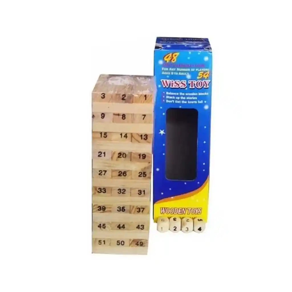 Juego jenga de madera 54 bloques y 4 dados , EXELENTE MADERA Y ACABADOS Juego para máximo 10 personas. Consiste en sacar bloques de la mitad de la torre, para luego colocarlos en la parte superior de la misma, evitando que se caiga. Juego para todas las edades muy sencillo, rápido y entretenido para ser jugado con varias personas y en distintas formas. Material: madera Fichas: 48 piezas 4 dados. Medidas del producto armado 23.5 x 7.5 cm