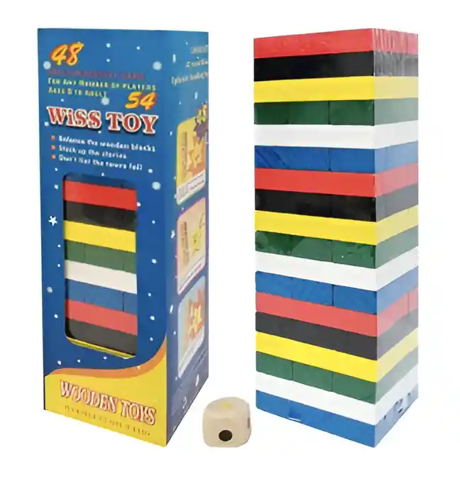 Este juego de mesa Jenga con bloques de colores es una opción emocionante y divertida para disfrutar en familia o con amigos. Con su diseño de torre de madera, reta a los jugadores a poner a prueba su destreza, concentración y pulso firme mientras intentan retirar los bloques sin que la torre se desmorone. Cada movimiento trae un nuevo desafío, garantizando momentos llenos de risas y tensión. Perfecto para cualquier reunión o tarde de juegos, este clásico asegura entretenimiento para todas las edades y niveles de habilidad. Ficha Técnica: Material: Madera Dimensiones de los carros: 20 cm x 6 cm x 6 cm Edad recomendada: + 8 años Certificado de conformidad: SL-CS-210044 Referencia: DM552 ** _Para defectos de fábrica o retractos: \_Por favor revise el producto apenas lo reciba y antes de usarlo. No aplican ley de retracto o defectos de fábrica luego de usar el producto. Se manejan máximo 5 días para reportar defectos de fábrica (por ejemplo, producto funciona mal, piezas faltantes, rotas, etc). Para hacer efectiva la devolución el producto debe devolverse con el empaque original, el cual debe estar en buen estado, incluir todos los documentos y las partes completas y sin daños.