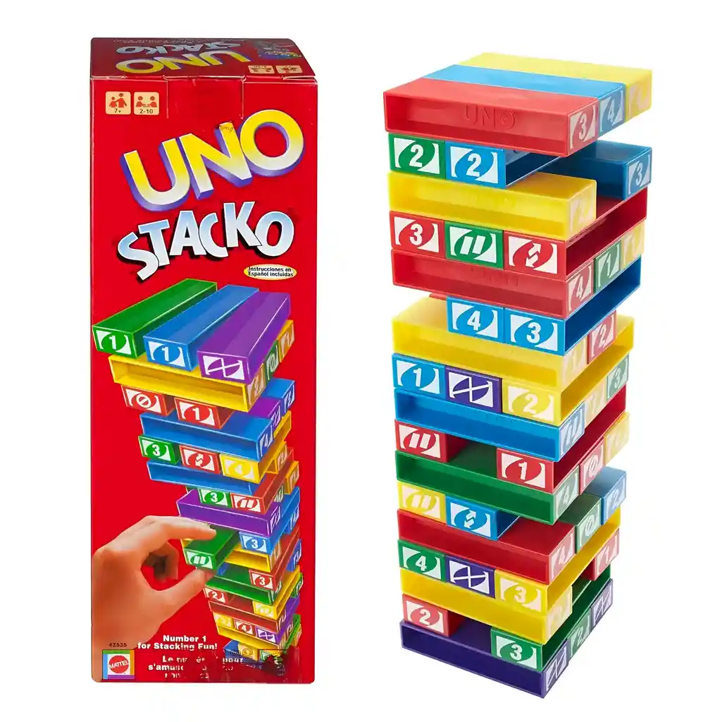 ¡Lleva la emoción del UNO a una dimensión totalmente nueva con UNO Stacko, el juego que combina la estrategia de las cartas con el desafío físico de una torre inestable! Construye la torre con los bloques de colores que llevan los números y símbolos icónicos de UNO. Luego, por turnos, saca un bloque que coincida con el color o el número del bloque anterior y colócalo en la cima. ¡Suena fácil, pero cada movimiento pone a prueba tu pulso y tu astucia! Ten cuidado con los bloques de acción como Reversa, Salta Turno y Toma Dos, que le dan un giro inesperado a la partida. Es la mezcla perfecta de suspense, risas y estrategia para cualquier reunión familiar o fiesta con amigos. ¡No seas tú quien derrumbe la torre! Ficha Técnica: Material : Plástico ABS no tóxico, inodoro e inofensivo Edad Recomendada : + 7 años Dimensiones del producto : 26 cm x 8 cm x 8 cm Certificado de conformidad: E5-0359-2021 Referencia: 0149 Términos de garantía: Para defectos de fábrica o retractos: Por favor revise el producto apenas lo reciba y antes de usarlo. No aplican ley de retracto o defectos de fábrica luego de usar el producto. Se manejan máximo 5 días para reportar defectos de fábrica (por ejemplo, producto funciona mal, piezas faltantes, rotas, etc). Para hacer efectiva la devolución el producto debe devolverse con el empaque original, el cual debe estar en buen estado, incluir todos los documentos y las partes completas y sin daños.