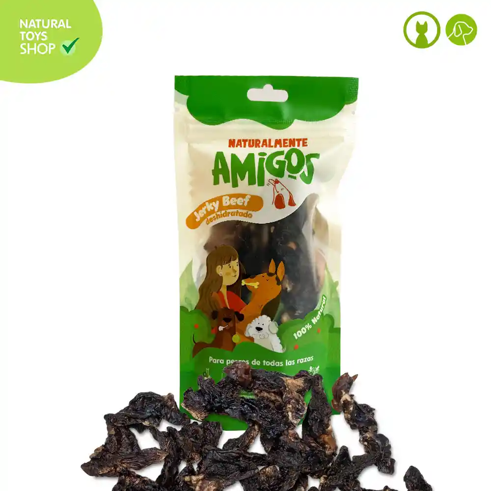 Nuestro Yerky esta perfectamente deshidratado, es una fuente de proteína de muy alta calidad. Libre de Gluten y grasas. Es considerado un aperitivo de carne ideal para todos los perros de todas las raza Es un suplemento alimenticio, ya que aporta proteína real, esta deshidratado y es masticable! Nuestros productos aportan proteína que contribuyen a la masa muscular, también son fuente de fibra. En el proceso de deshidratación se vuelven blandos y pierden su dureza por lo que se deshacen fácilmente en el paladar de la mascota disfrutando su sabor natural Nuestro proceso de deshidratación le brinda una textura única permitiendo que la mascota disfrute masticando el producto y se entretenga mientras se lo come, ademas, cuentan con un proceso especial para eliminar cualquier parasito, germen y bacteria. No utilizamos colorantes, endulzases, sales, artificiales, preservativos ni nada por el estilo, nuestra filosofía es cero químicos. INGREDIENTES PRINCIPALES Este producto esta elaborado del Carde Deshidratada cortada en tiras INDICACIONES DE USO Suministre por unidad y supervise mientras la mascota lo esta consumiendo. La palatividad es alta, son masticables para cualquier raza desde los 3 meses de edad por su textura blanda. Entretiene por su textura y es 100% comestible por ser natural! CONSERVACIÓN DEL PRODUCTO El producto puede dejarse en todo momento con la mascota. La temperatura ambiente ideal es entre 15 y 25 grados centígrados. No dejar en el pasto o jardines para que bichos no se peguen y puedan contaminarlo. Mantener los productos que no se están utilizando en el empaque original bien sellado. Tiempo Maximo de consumo 36 meses El producto esta listo para consumo, una vez abierto CANTIDAD DIARIA RECOMENDADA Tamaño de la raza peso de la raza equivalente por días Razas Pequeñas = 2 a 10 kg = 2 Unidades Razas Medianas = 10 a 22 kg = 3 Unidades Razas Grandes = 22 a 45 kg = 5 Unidades Razas Gigantes = Más de 45 kg = 8 Unidades COMPOSICION GARANTIZADA Grasa……MIN……. 9,28% Humedad..MAX….. 4,49% Cenizas…..MAX….. 4,62% Proteina….MIN….... 74,26%
