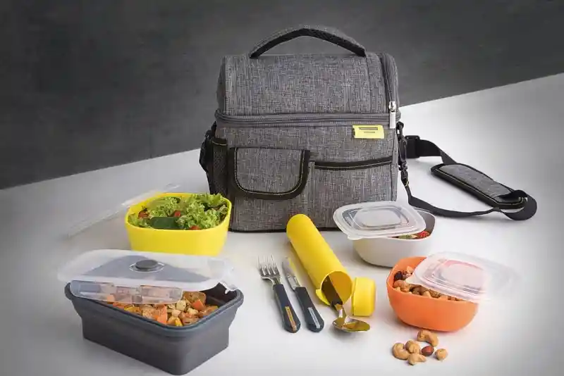 Bolsa térmica de poliéster con 5 compartimentos, amplio espacio interno, cierre con zíper y asa extraíble. Puede usarlo con el asa de mano o de hombro. <br>Estuche de polipropileno. <br>Cubiertos con láminas de acero inoxidable y mangos de polipropileno. <br>Potes y tapas de polipropileno. Tapas transparentes. <br>Pote retráctil de silicona con tapa de polipropileno. Posee una tapa con trabas, optimiza el espacio dentro de la bolsa térmica y al momento del almacenamiento.