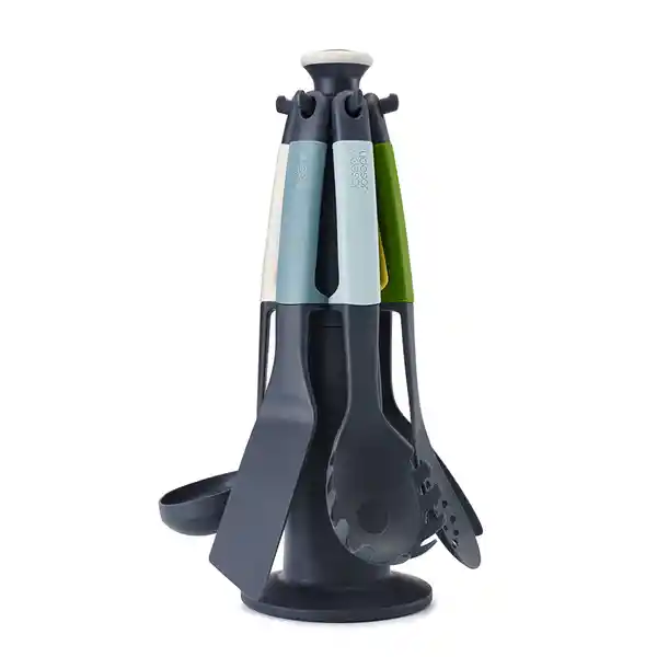 Set Contiene 7 Unidades. Incluye: Cuchara Sólida Elevate 1 Und + Cuchara Ranurada Elevate 1 Und + Servidor de Espagueti Elevate 1 Und + Turner Ranurado Elevate 1 Und + Cucharón Elevate 1 Und + Pinzas de Acero de Silicona Elevate 1 Und + Soporte de Almacenamiento Giratorio Elevate 1 Und de Medidas: 36 x 16 x 16 cm – Peso: 21 Gr. El Soporte de Almacenamiento Giratorio Tiene Una Base Antideslizante Que lo Hace Ideal Para Mantenerlo al Alcance de la Mano Sobre la Encimera de la Cocina. La Gama Elevate de Utensilios de Cocina Cuenta Con un Soporte Para Herramientas y un Mango Con Peso, lo Que Significa Que Cuando se Coloca Hacia Abajo, el Cabezal de la Herramienta o el Cuchillo no Toca la Superficie de Trabajo, lo Que Reduce el Desorden y Mejora la Higiene. Material: Estructura de Nylon Endurecido, Con Mango de Polipropileno y Centro de Acero el Juego