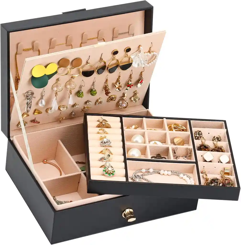 El Alhajero Joyero Estuche Organizador Joyería Amplio Multiusos en color rosa de la marca Black Mamut es el accesorio perfecto para mantener tus joyas organizadas y protegidas. Con una capacidad de hasta 100 joyas, este estuche cuenta con 50 compartimentos y 3 cajones, brindándote amplio espacio para guardar tus collares, pulseras, anillos y pendientes favoritos. Su material exterior de cuero ecológico le da un toque elegante y duradero, mientras que el interior también está revestido de cuero ecológico para proteger tus joyas de arañazos y daños. Además, este joyero cuenta con cerradura para mayor seguridad. Con dimensiones de 23 cm de largo, 17 cm de ancho y 9 cm de altura, es compacto y fácil de transportar. ¡Mantén tus joyas organizadas y en perfecto estado con este práctico y hermoso joyero!