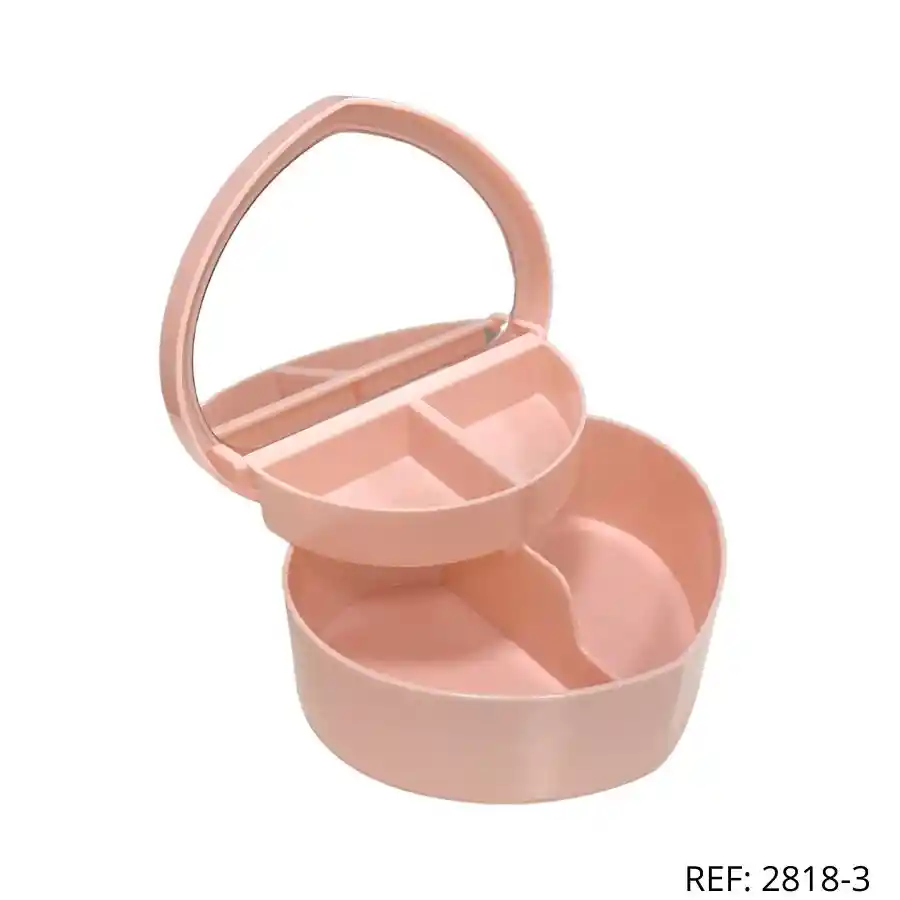 Joyero rosado en forma de corazón con espejo y compartimentos. Ideal para organizar accesorios con estilo y practicidad.