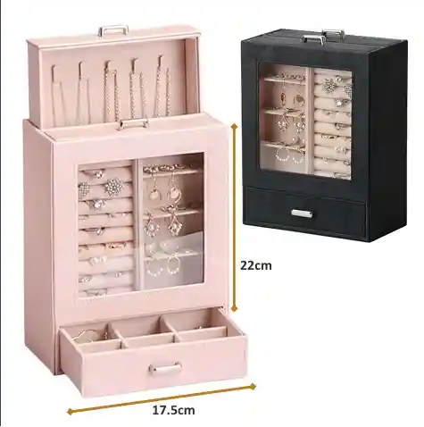 4. Joyero Organizador con Ventana y Compartimento Secreto Un elegante estuche de almacenamiento diseñado para proteger y exhibir piezas de joyería de forma clasificada. Diseño Multinivel: Panel de Exhibición: Ventana transparente que permite ver anillos y pendientes organizados en ranuras aterciopeladas. Sección Superior: Compartimento oculto que se abre para revelar ganchos ideales para collares y cadenas. Cajón Inferior: Dividido en seis compartimentos cuadrados para pulseras o accesorios más grandes. Dimensiones: Posee una altura de 22 cm y un ancho de 17.5 cm. Colores Disponibles: Acabados en textura de piel sintética en color rosa pastel y negro.