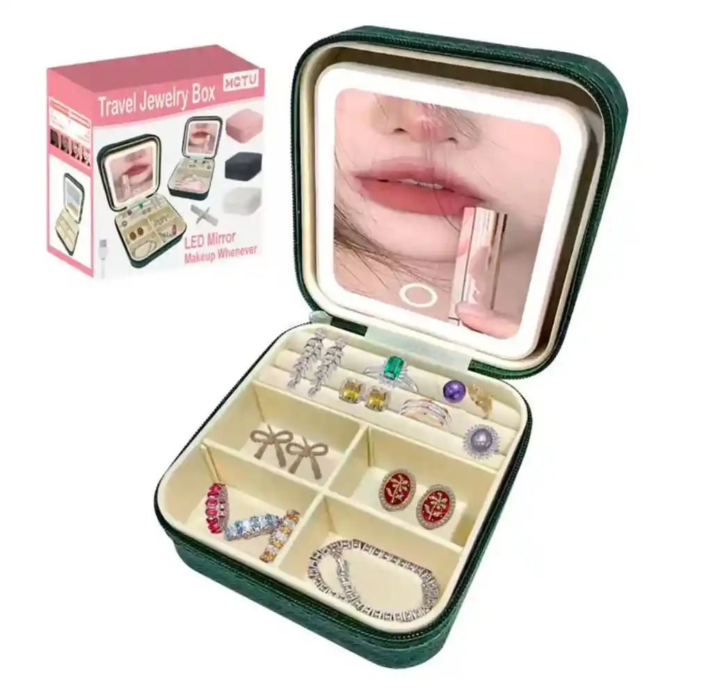 JOYERO NUEVO DISEÑO CON ESPEJO Y LUZ Hecho sintetico y franela, antidesgaste, sin deformación, sin decoloración, fácil de usa con cremallera. Forro interior suave: el forro interior es delicado y suave, más suave y cómodo para cuidar tus joyas preciosas, lo que puede evitar arañazos y daños. Tamaño 10cm