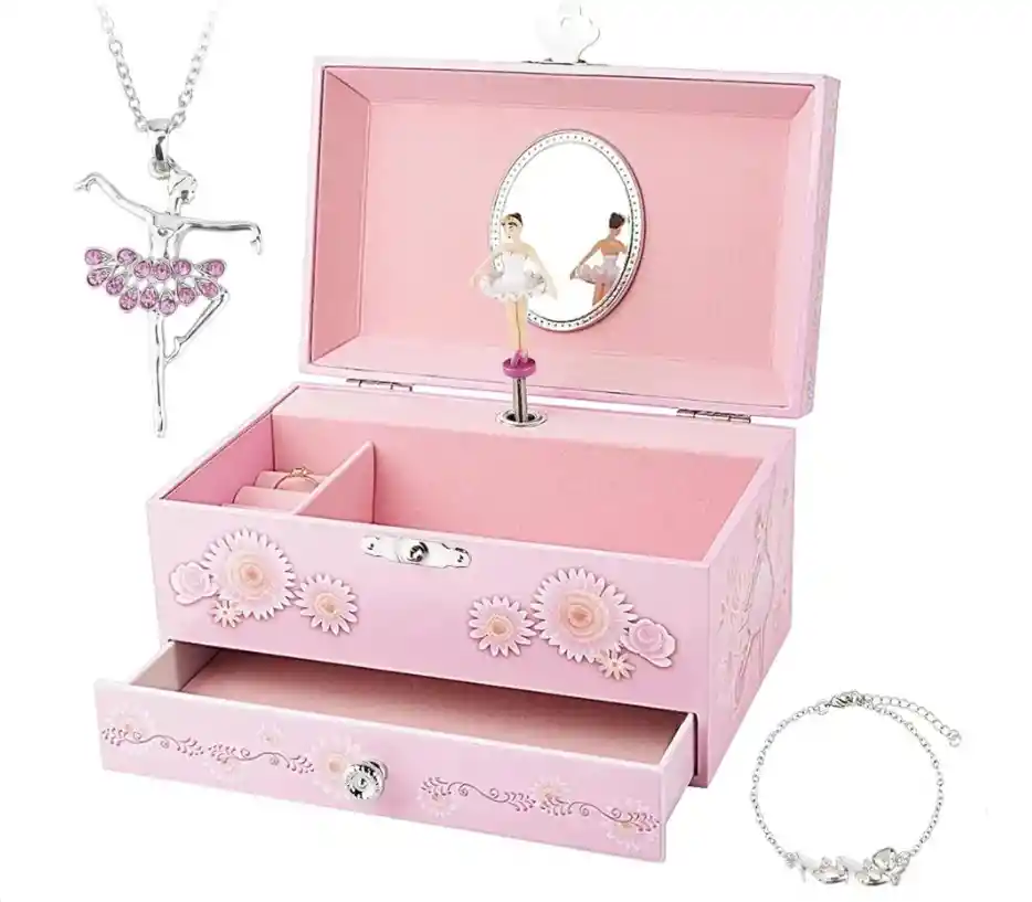 🩰 Caja de Joyería Musical para Niñas – Bailarina Rosa Encantadora caja de joyería musical infantil con delicado diseño de bailarina, perfecta para guardar joyas y pequeños tesoros. Incluye cajón inferior y compartimentos internos que ayudan a mantener todo organizado. Al abrir la tapa, suena la clásica melodía “El Lago de los Cisnes”, mientras una bailarina gira suavemente, creando un momento mágico que enamora a las niñas. Viene con un juego de joyas incluido, lo que la convierte en un regalo completo y especial para cumpleaños, celebraciones o fechas especiales. Su diseño en color rosa, elegante y tierno, la hace ideal como elemento decorativo para habitaciones infantiles. ✨ Características destacadas 🎶 Melodía: El Lago de los Cisnes 🩰 Bailarina giratoria 🗄️ Cajón inferior para mayor almacenamiento 💍 Incluye juego de joyas 🎁 Ideal como regalo para niñas 📏 Medidas aproximadas Largo: 18 cm Ancho: 12 cm Alto: 10 cm