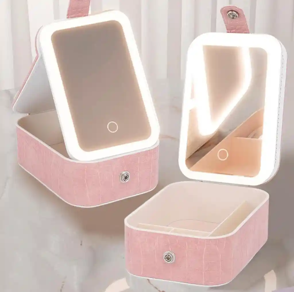 Estuche de maquillaje con espejo iluminado para viajes al aire libre, uso en el hogar, caja de almacenamiento de cosméticos, caja de almacenamiento de espejo de maquillaje portátil recargable, espejo iluminado, estuche de maquillaje de viaje, estuche cosmético.