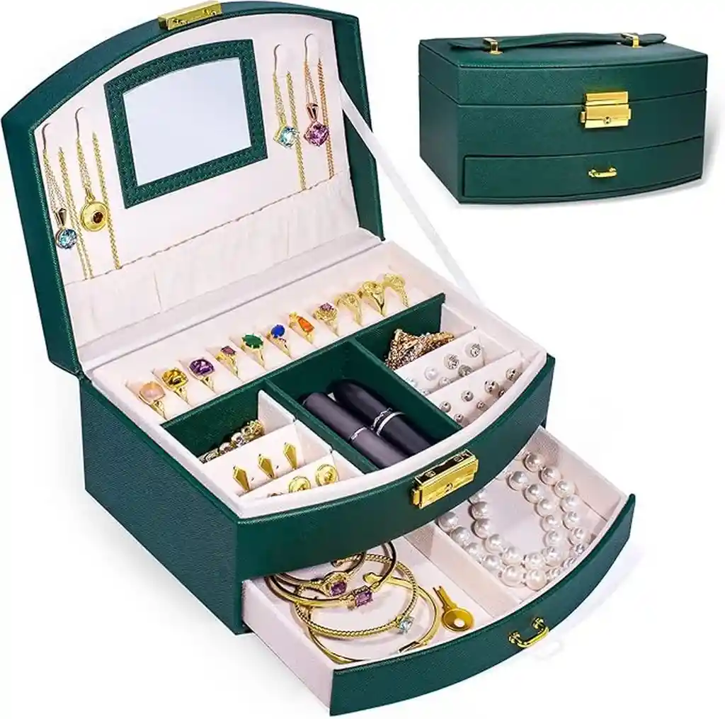 Elegante y funcional, este joyero de dos capas con espejo y cajón extraíble es la solución perfecta para organizar y proteger tus joyas. Fabricado con piel sintética resistente a la suciedad y al agua, y con un suave forro de terciopelo en su interior, garantiza la seguridad de anillos, collares, aretes y pulseras. Su diseño con cerradura proporciona mayor seguridad, mientras que su distribución interna optimiza el espacio con compartimentos ajustables, ranuras para anillos y ganchos para collares con bolsillos elásticos. Compacto y portátil, incluye un asa para fácil transporte y aporta un toque sofisticado a cualquier tocador. Ideal como regalo para cualquier ocasión especial. Ficha Técnica: Materiales: Cuero - Terciopelo Dimensiones: 25 cm x 23 cm x 20 cm Uso: Joyas Con espejo, cerradura y llave ** _Para defectos de fábrica o retractos: \**_Por favor revise el producto apenas lo reciba y antes de usarlo. No aplican ley de retracto o defectos de fábrica luego de usar el producto. Se manejan máximo 5 días para reportar defectos de fábrica (por ejemplo, producto funciona mal, piezas faltantes, rotas, etc). Para hacer efectiva la devolución el producto debe devolverse con el empaque original, el cual debe estar en buen estado, incluir todos los documentos y las partes completas y sin daños.