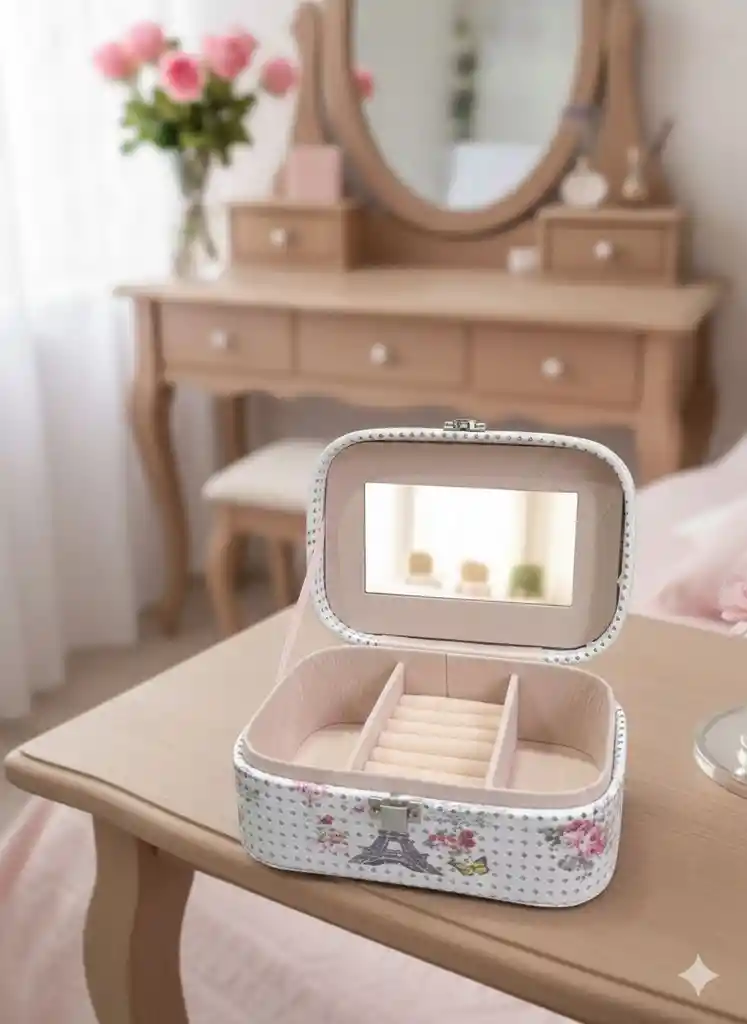 Joyero y Organizador París – Portátil de Viaje (1 Capa) Joyero práctico y compacto, ideal para organizar y proteger tus accesorios durante viajes o uso diario. Su diseño de una sola capa facilita el acceso y el orden de tus joyas. Tamaño cómodo para llevar en bolso o maleta. Características: 💍 1 capa interna – organización sencilla y funcional. 🧳 Portátil y ligero – ideal para viaje. 🎨 Diseño estilo París – elegante y práctico. 📏 Tamaño: 15 x 10 cm. Perfecto para mantener tus accesorios ordenados y seguros en todo momento.