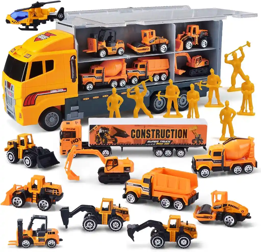 Gran valor. Juego de juguetes para camión de 11 mini construcción, en diferentes diseños y funciones en un camión portador. Incluyendo helicóptero, cargador de ruedas, camión volquete, mezcladora, excavadora, retroexcavadora, rodillo de camino, etc. Ideal para juegos de construcción de camiones infantiles. Tamaño perfecto para niños pequeños. Gran coordinación de ojos y desarrollo de la educación preescolar. Perfecto como regalo de cumpleaños, decoración para tartas, juguetes para asiento de automóvil.