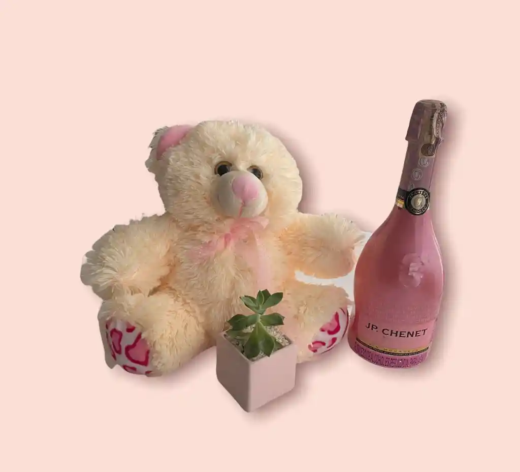 Hermosa ancheta con botella JP. Chenet de 750ml, Peluche en forma de oso, planta en forma cuadrada Variada 5 cm Alto 5 cm Ancho. En Cerámica.